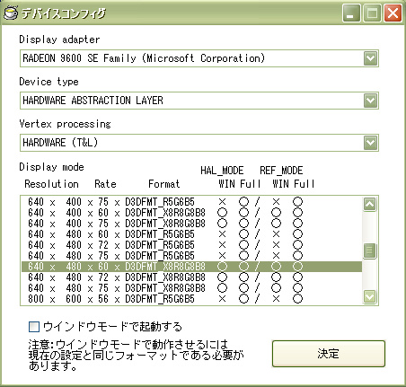 「config.exe」内の「画面設定」のこと。 使用デバイスや画面の大きさ、フルスクリーンの設定をします。 ![]() ・Display adapter ディスプレイアダプタの名前。 二つ以上持っているときは、どちらか選んでください。 ・Device type デバイスタイプです。 ハードウエアーアブストラクションレイヤー(HAL): ビデオカードを通した高速なレンダリング処理を行います。 リファレンス ラスタライザ (REF): ビデオカードを通さないMicrosoft Direct3Dによるソフトウエアーレンダリング処理を行います。 速度的には HAL が最も高速で、REFはその数十~数百分の一以下の速度です。 REFは遅いかわり、ビデオカードの能力にかかわらずステンシルバッファや環境マッピング等の機能を実行する能力を持っています。 ・Vertex processing 動作フラグです。 HARDWARE(T&L): 頂点変換やライティング処理をビデオカード側で行います。 これによりCPUの負担が軽減され処理速度が向上します。 SOFTWARE: CPU側で処理を行います。 ビデオカードの性能が低く、上手く起動できない時に設定してください。 ・Display mode ディスプレイのモードです。 左から「ウィンドウの解像度」「リフレッシュレート」「フォーマット」「それぞれのモードでのウィンドウモードの可否」となっています。 ウィンドウモードで起動するにチェックを入れると、全画面ではなくウィンドウで起動します。 |