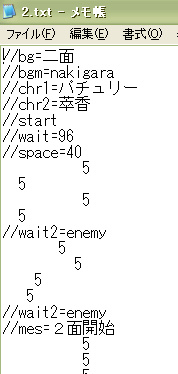 ・「//wait2=文字」:次の敵が出るまで、指定動作だけ待ちます。(enemy:敵が全て消えるまで。event:イベント終了まで)