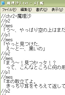 ・「//chr1=キャラ名」:パチュリー側の読み込んである画像を変えます。「キャラ名.png」を読み込みます。
